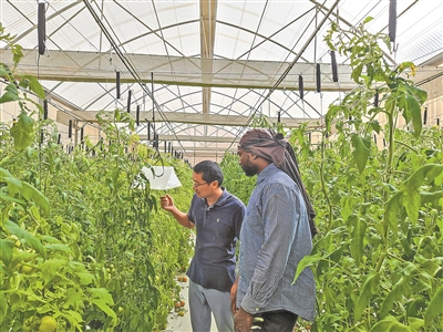 中国专家(左)在佛得角检查当地大棚蔬菜病虫害发生情况。