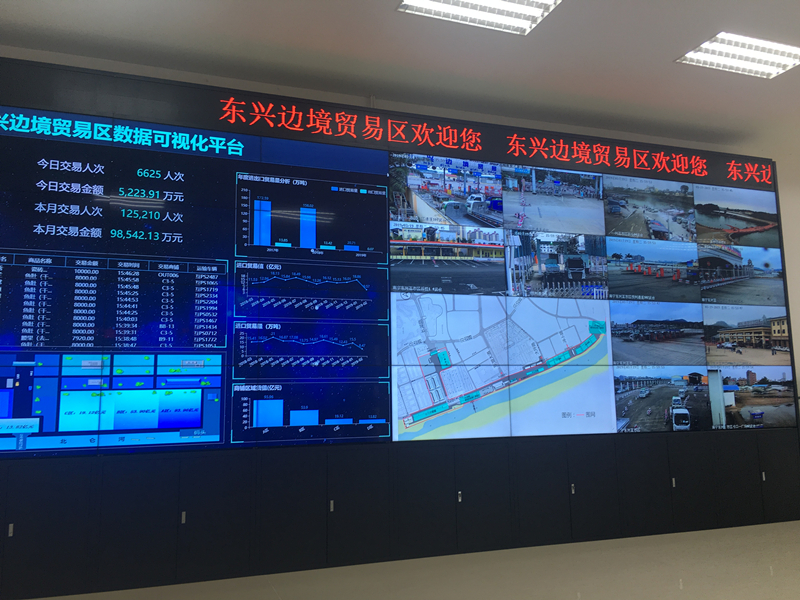 图为东兴边境贸易区数据可视化平台,实时展示东兴边境中越交易人次、交易金额等内容。