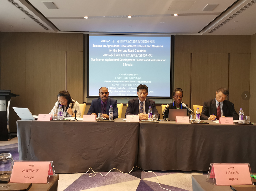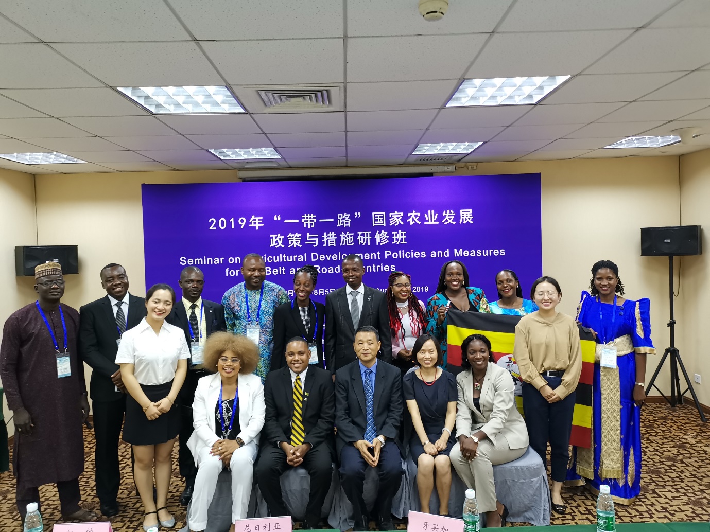 2019年7月16日,我中心承办的2019年“一带一路”农业发展政策与措施研修班在北京成功开班。图为开班仪式后王立庆处长和张倩处长与学员合影。