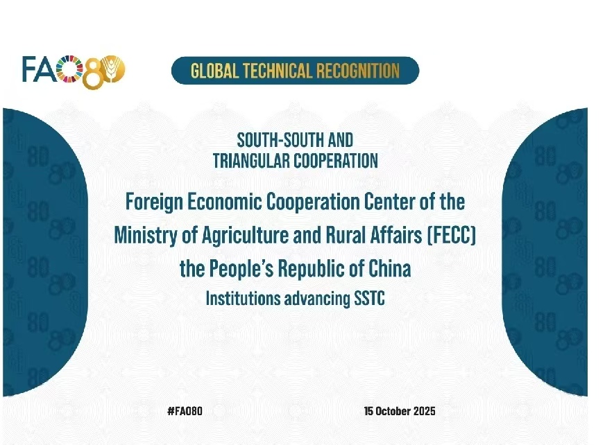 20251015日,为庆祝FAO成立80周年,FAO在总部线上线下方式隆重举办全球技术成就表彰大会,农业农村部对外经济合作中心荣获FAO“南南合作与三方合作领域”杰出贡献表彰。由我中心组织实施的中国—FAO—乌干达南南合作项目、中国—FAO—佛得角南南合作项目、中国—FAO—斯里兰卡南南合作项目三个项目荣获FAO“南南合作与三方合作领域”杰出贡献表彰。FAO总干事屈冬玉博士出席活动并为相关线下参会代表颁发证书,外经中心主任金轲线上出席此次活动。